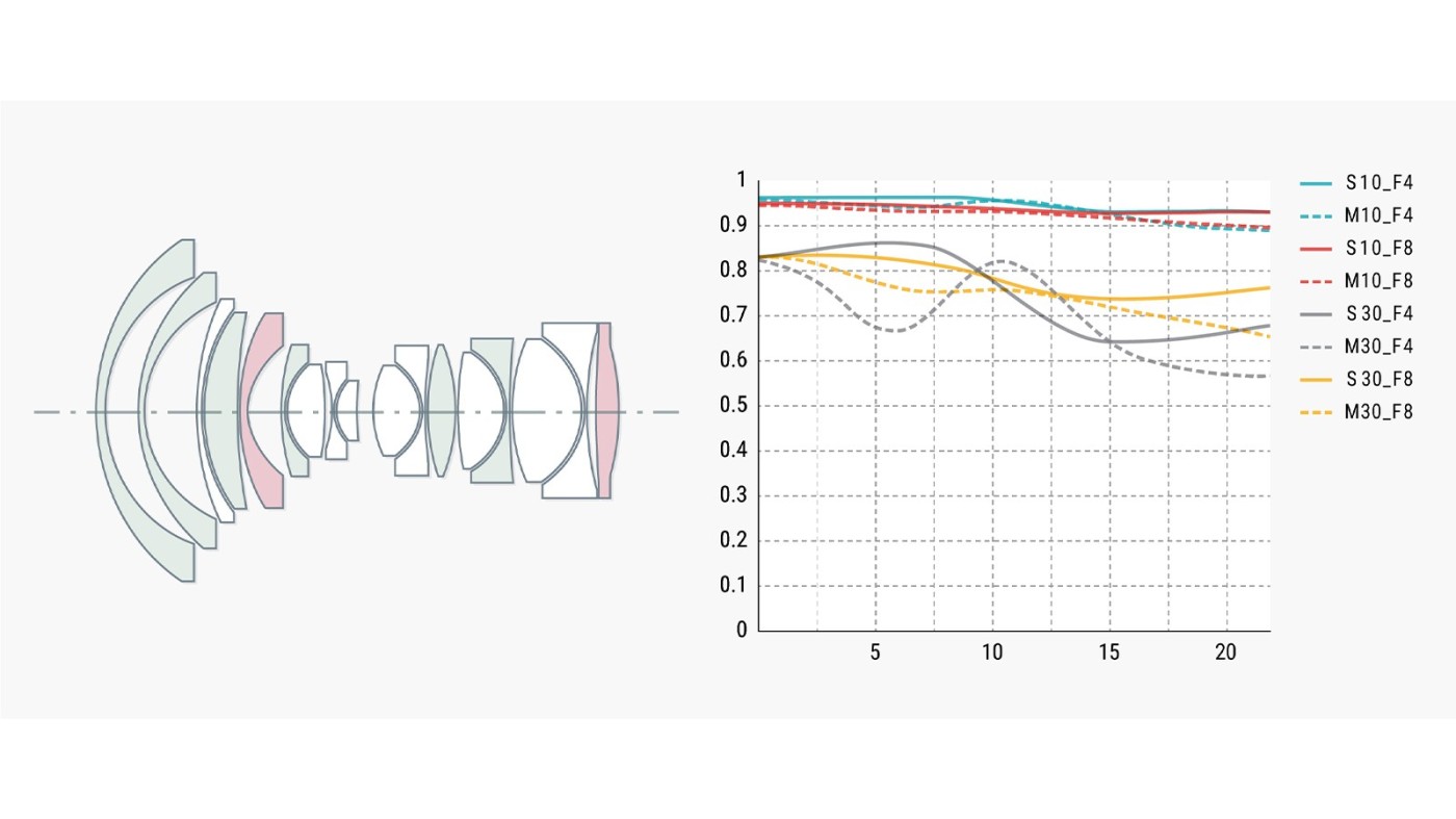 さらに、直径64mmの大きなイメージサークルにより、35mmフルサイズセンサーだけでなく、44×33mmの中判センサーカメラにも対応。大型のASPH非球面レンズを2枚含む光学設計により、歪曲収差や色収差、色にじみを効果的に抑制し、クリアで高精細な描写を実現する。