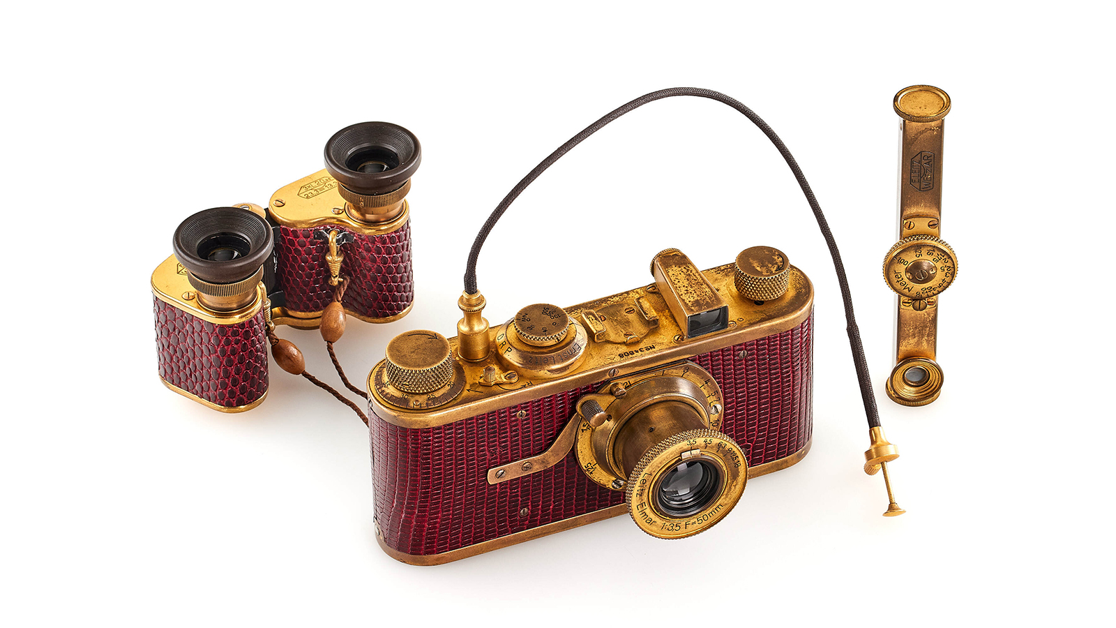 そのアイテムとはロット番号7の「Leica I Mod. A Luxus special outfit」。1929年に製造が開始され、わずか95台しか製造されなかった“ルクサス(ラグジュアリーの意)”は現存するのが数台のみと非常に希少。今回出品されたのはその中の1台で、1929年に製造されたシリアルナンバー「34808」の個体だ。「special」と名付けられているのは、付属しているアクセサリーが主な理由。このアイテムには今回、同じ外観デザインの「ルクサス」双眼鏡3×20と、ゴールドのメッキが施された「ライツ・フィノット」ケーブルレリーズ と「フォファー・ルクサス」距離計が付属しており、4点セットとしてオークションに出品されたのは今回が初めてだった。そうした珍しさから、30万~36万ユーロでの落札が予想されていたが、最終的には36万ユーロ(落札手数料を含む)で落札された。