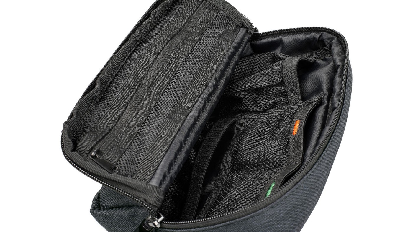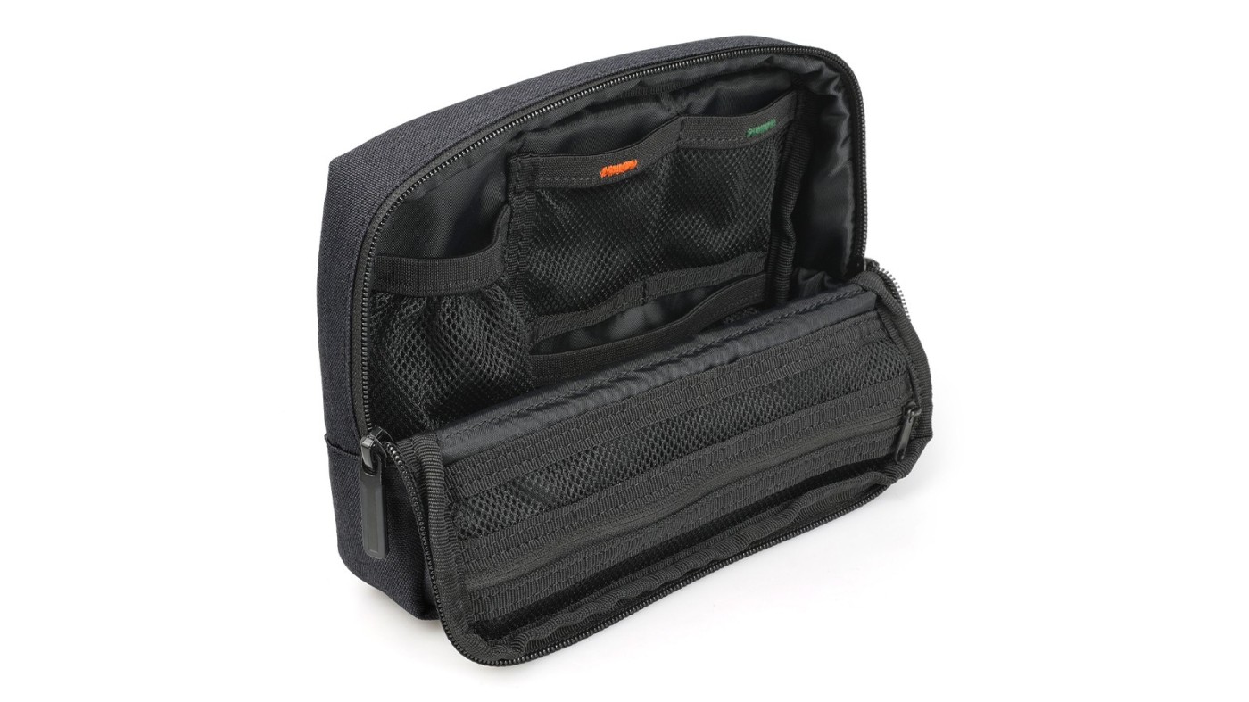 スマートフォンで本格的な撮影を行うときに必要なコンバージョンレンズやミニ三脚、LEDライトなどをまとめて収納することができるマルチガジェットポーチ。