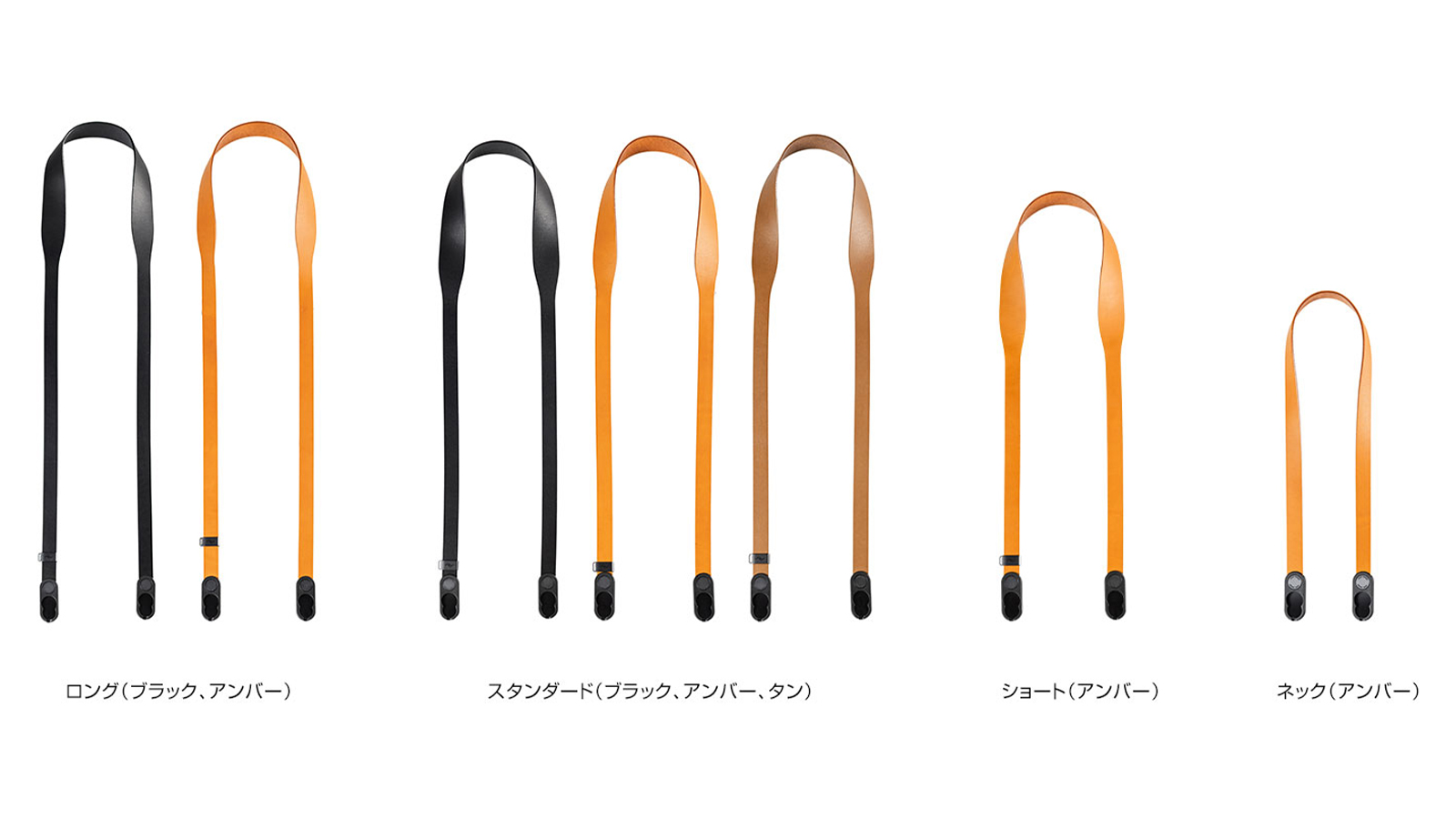 「ロング」「スタンダード」「ショート」「ネック」4つのサイズ展開で、サイズにより「ブラック」「アンバー」「タン」を用意。どんなフォトグラファーも理想的なフィット感と持ち運びのスタイルを見つけることができる。