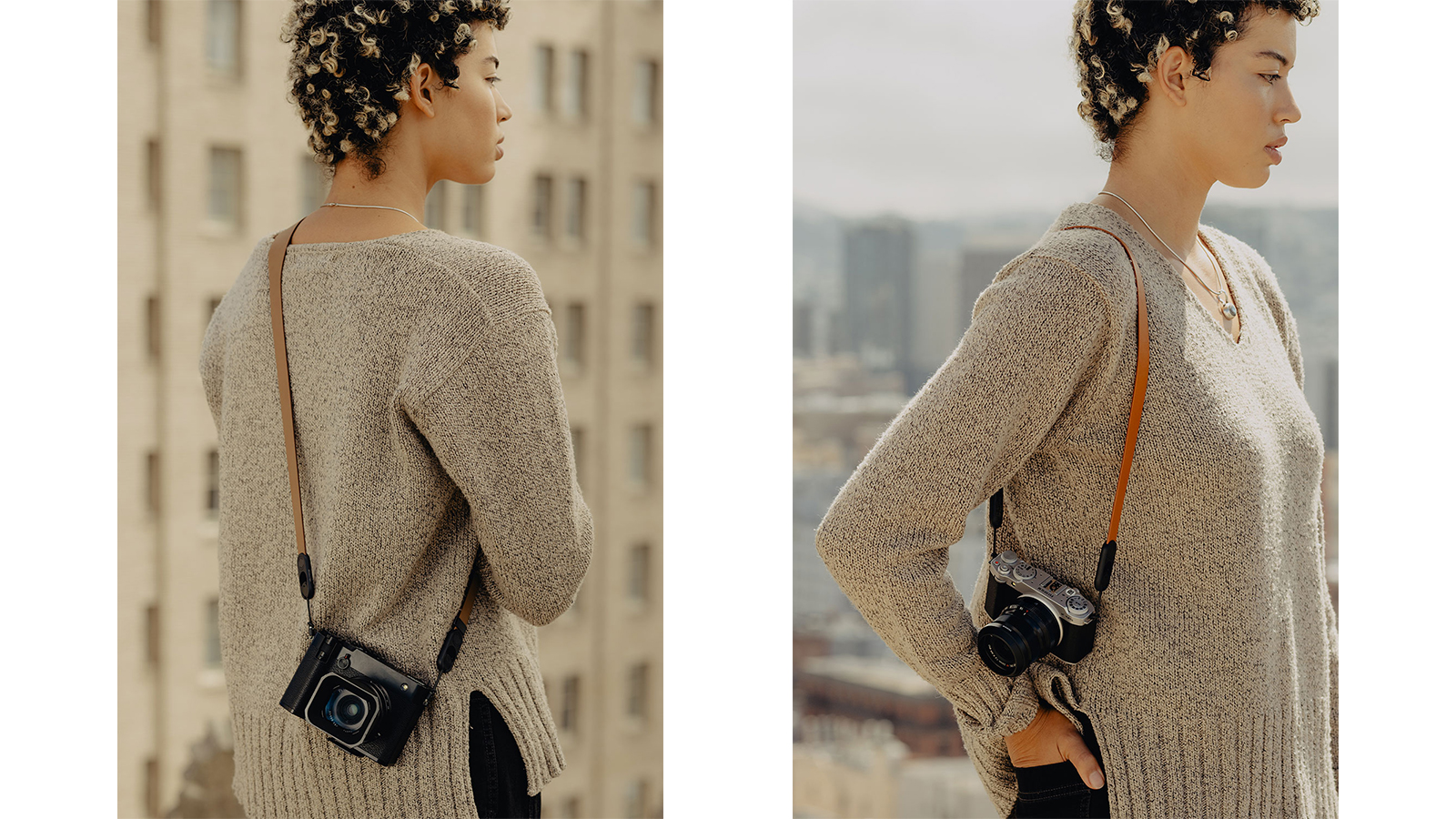 さらに、ストラップ部分には新たに独自開発のナイロン・ポリエステル製ロープ、もしくは高品質なフルグレインレザーを採用し、長時間の撮影や移動を驚くほど快適にする。余計な金属や装飾を削ぎ落とし、時代を超えて愛されるクリーンなデザインを実現。