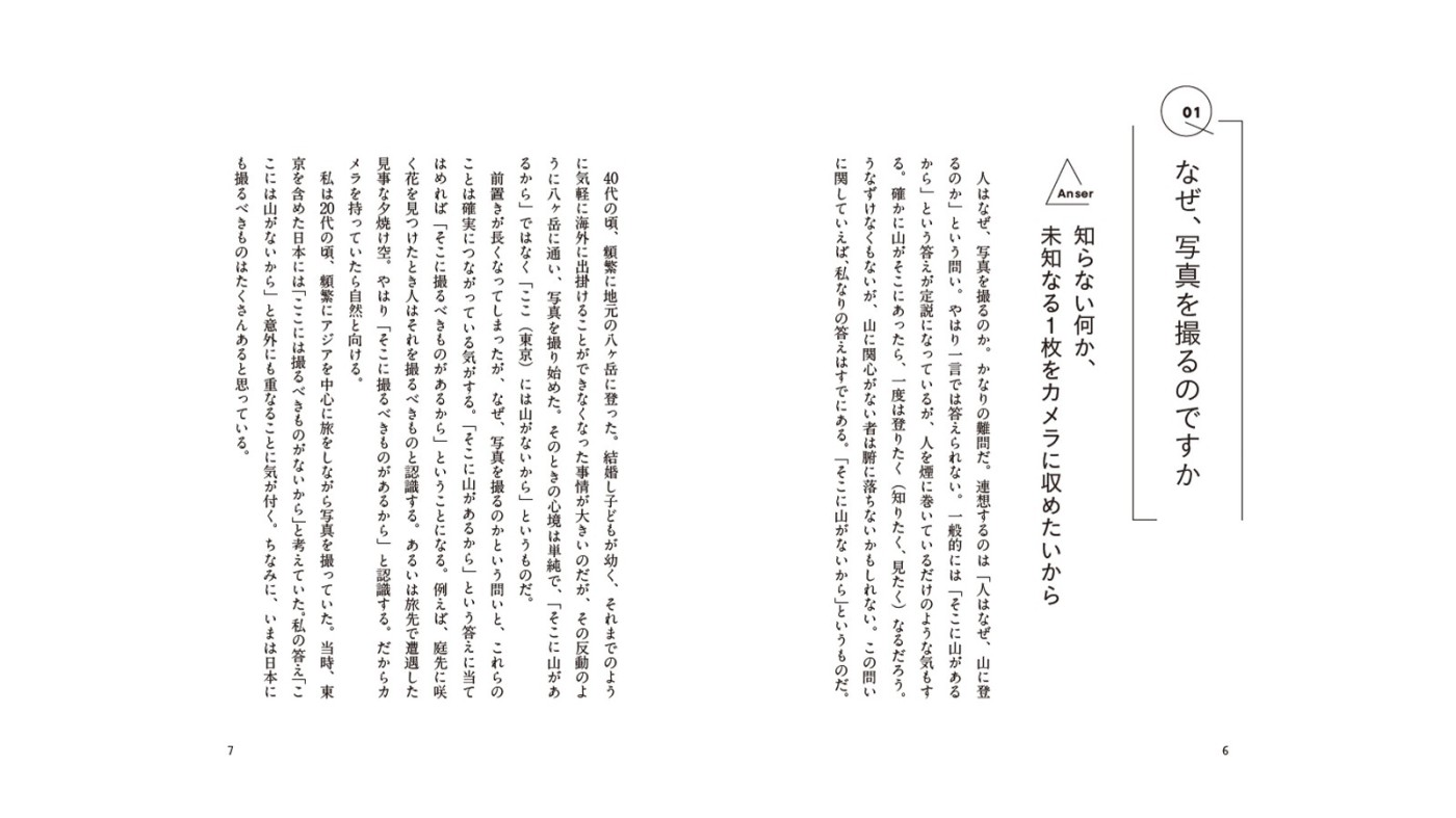 構成は1つのテーマごとに完結するQ&Aスタイル。最初から読み進めるのはもちろん、目次を見て気になったページから自由に拾い読みすることも可能。写真家として、また写真教育者として第一線で活躍する小林氏が、写真とどう向き合い、何を考えているのか。その核心に触れることができる読み応えのある文章に加え、2つの作品も収録。あわせて楽しめる内容になっている。