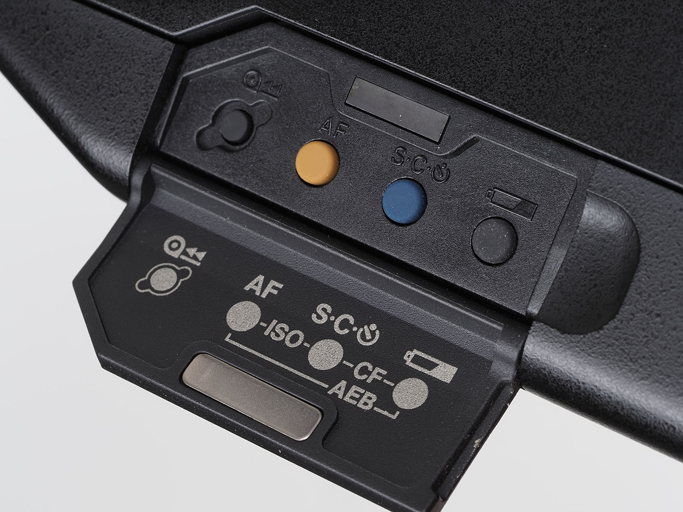 途中巻き戻しとか、巻き上げのシングルとコンティニュアスとかバッテリーチェックのボタンとかはボディ背面下のドアの下に隠され、ダイヤルと共に変更します。