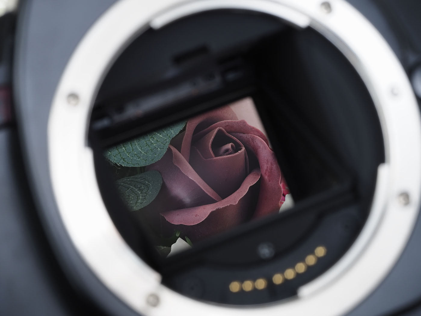 シャッタースピードを長時間露光に設定して、レンズを外して、裏蓋を開け、マウント面からアパーチャーを見てみます。意味はないのですが、カメラの背後に花を置いてペリクルミラーは素通しであることを証明してみました。