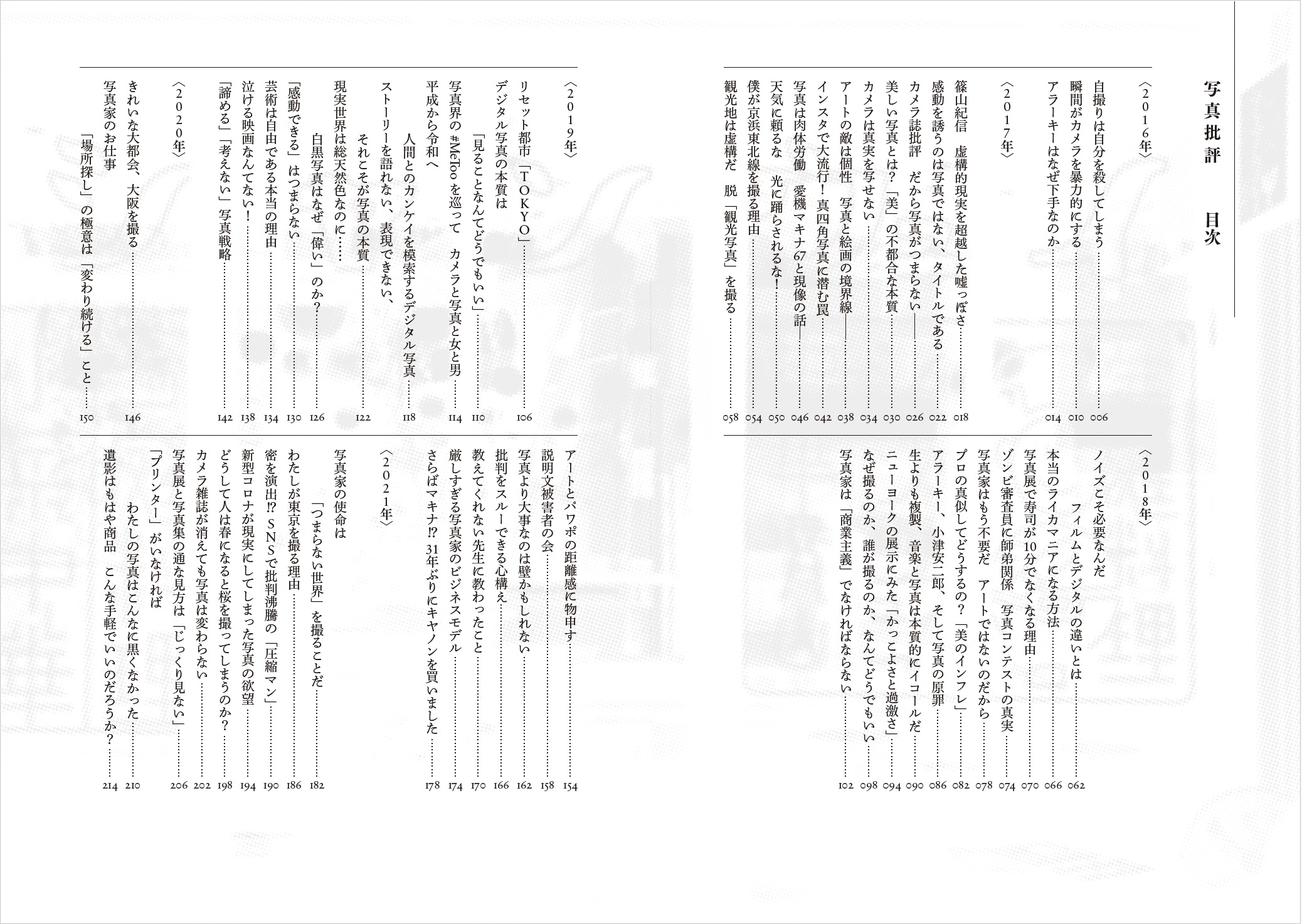2016年から2025年にかけて月刊誌『家電批評』に連載された「金村修の写真批評」から厳選したテキストに、新たに加筆・修正して編まれた写文集。