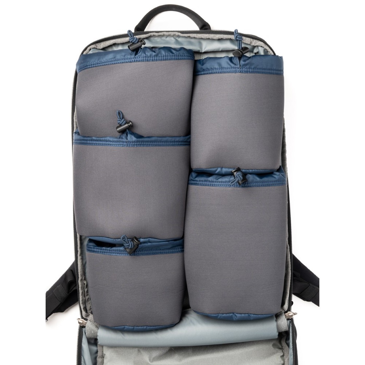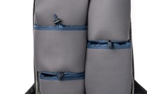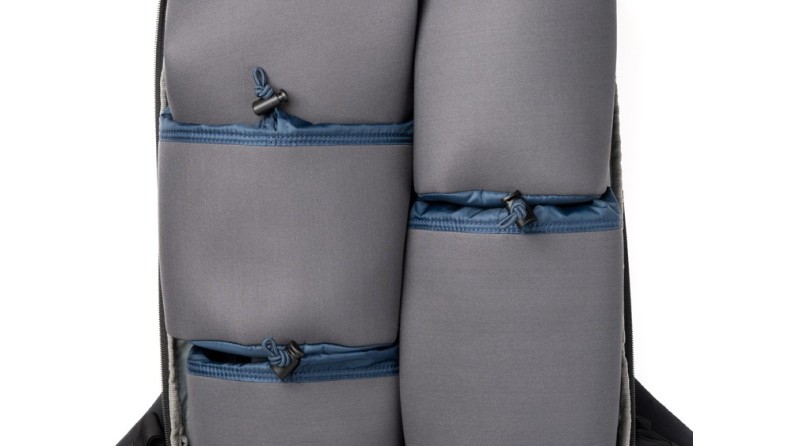 メインコンパートメントはディバイダーを用いず、付属のポーチや固定用ストラップ、機材の緩衝防止用のパッドを使用し、独自の機材レイアウトが可能。ボディやレンズ単体はもちろん、レンズを装着したカメラを収納できる設計で、柔軟で合理的なパッキングができる。