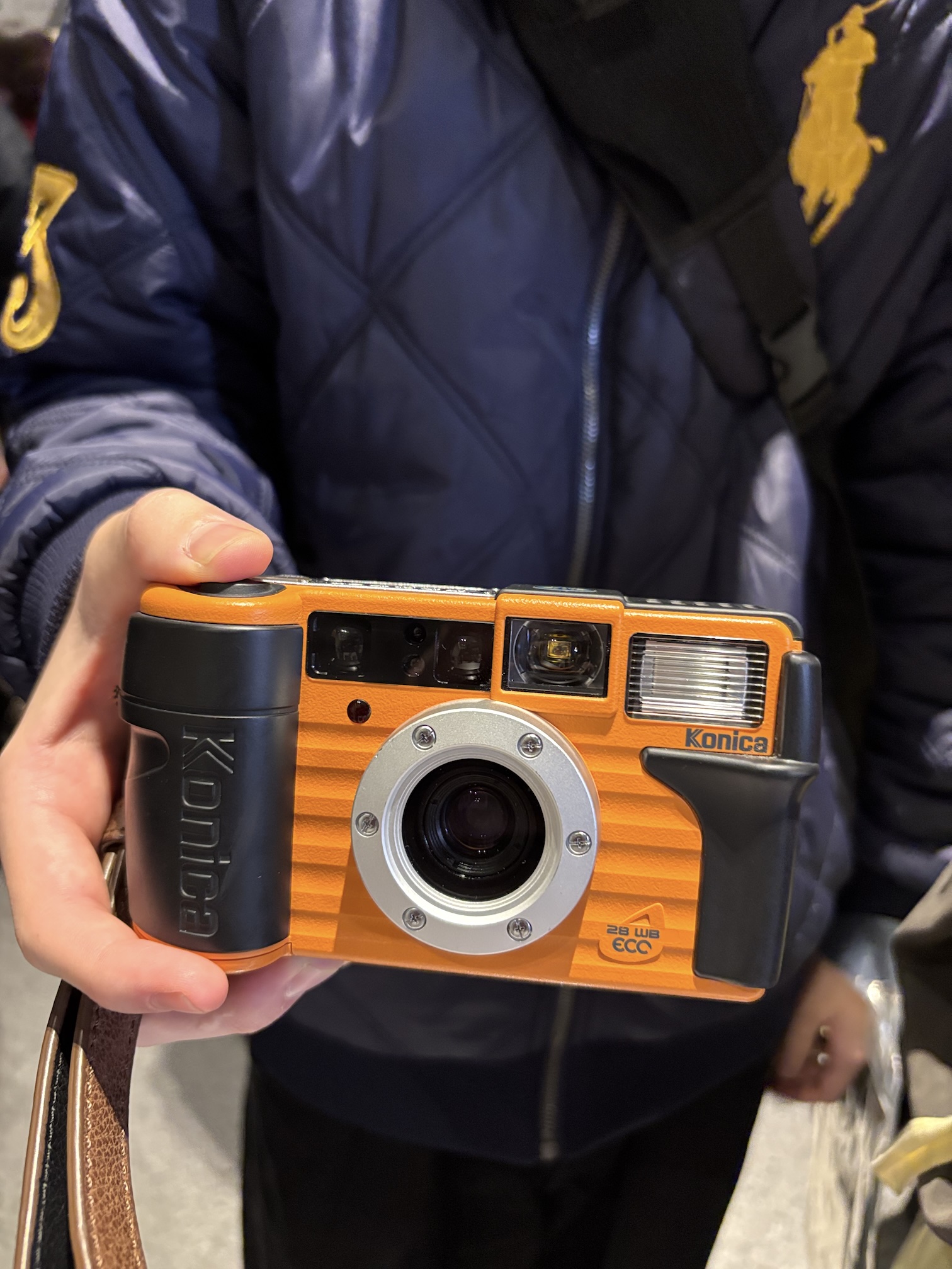 A young photo student with a very cool and very orange, Koncia. Designed for worksite documentation, these super tough cameras are fantastic choices for a compact camera. They have great lenses, are near-indestructible, weatherproof, and I mean c’mon just LOOK at it. Konica had a spectacular run back in the 1990s!