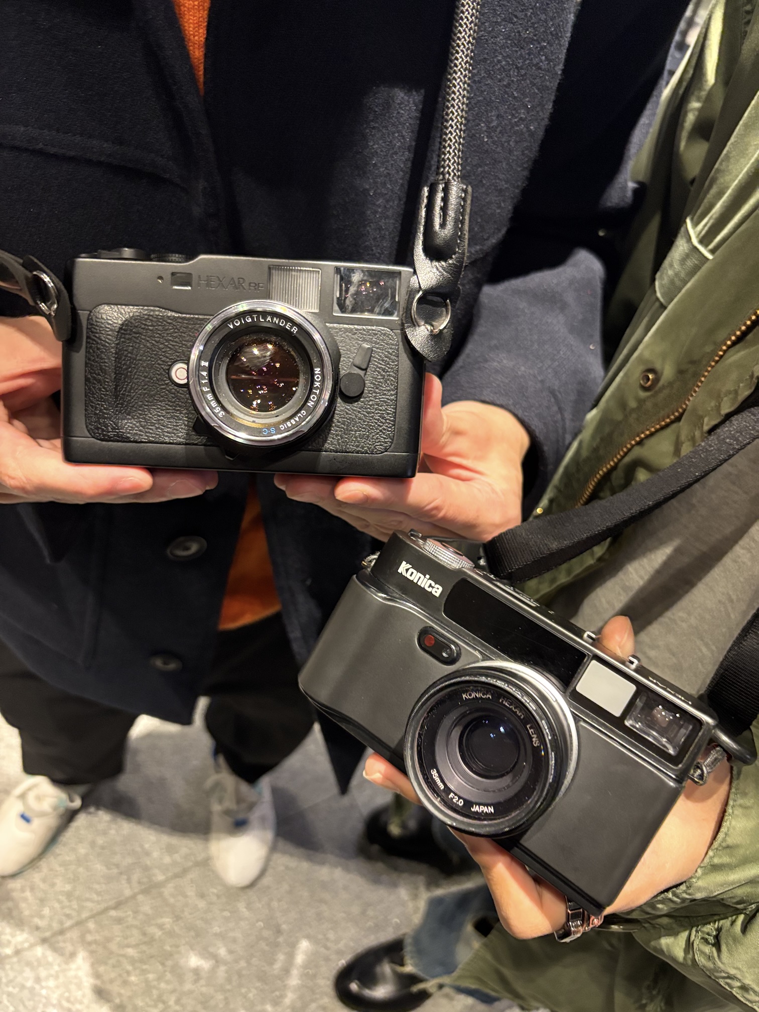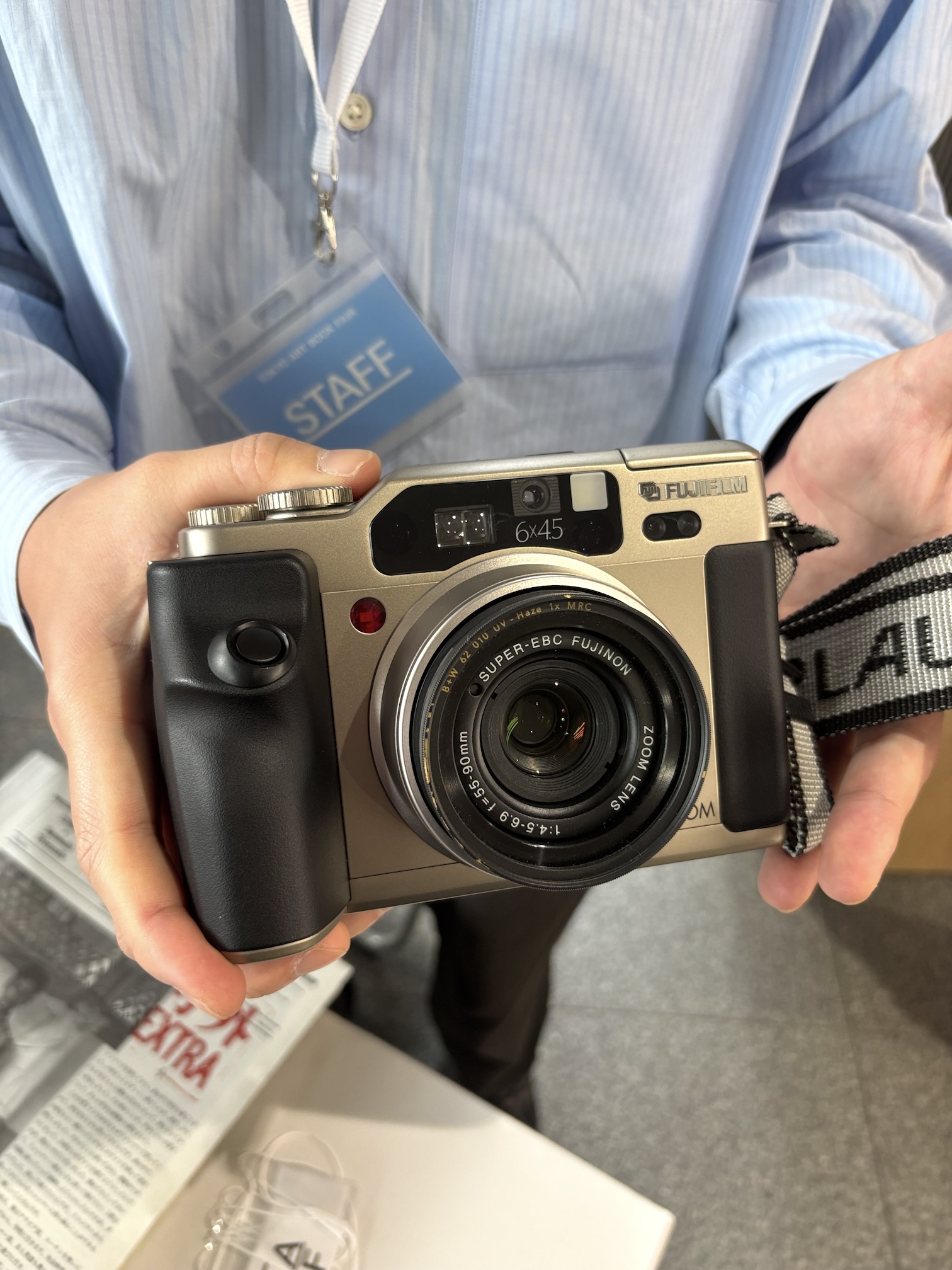 人気と会場の特性もあり、土曜の午後のTABFはかなりの混雑になります。そんな中で、ブランドつながりの偶然の「カメラ遭遇」が起きることもあります。ヘキサーRFを下げたドイツ人の若い写真家と話していたところ、オートフォーカス兄弟機のヘキサーAFを持った中国人写真家が通りかかり、快く2台並べて撮らせてくれました。機材でも本でも、こうしたリアルで個人的な出会いこそ、ブックフェアの醍醐味です。