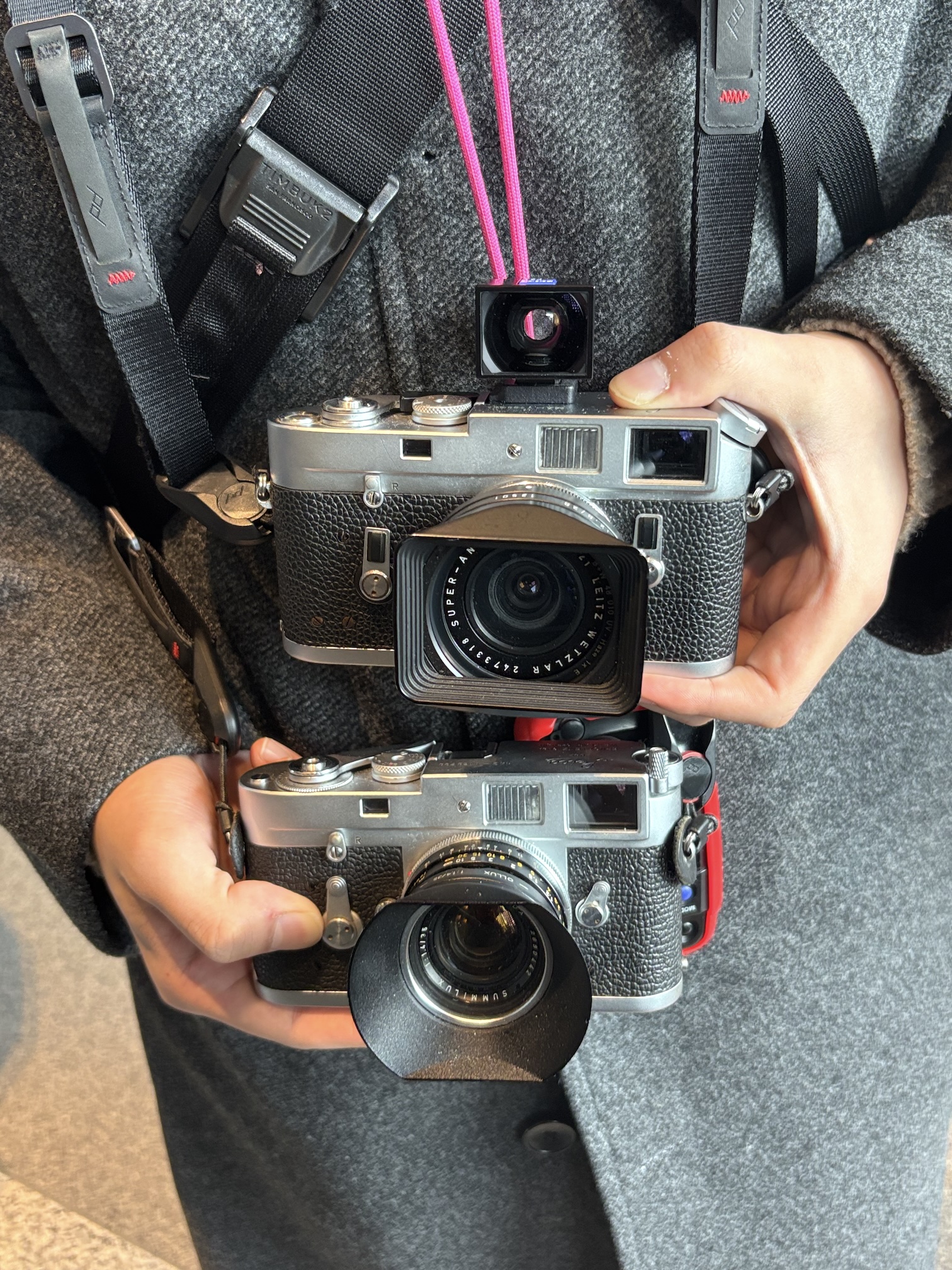 会場にいた若い写真家は、このクロームのライカ2台を首から下げていました。レンズフードはいずれも中国製の復刻版で、ずっと手頃な選択肢です。そもそもそのオリジナルのフードは、今ではボディ並みの価格が付くこともあるから…。