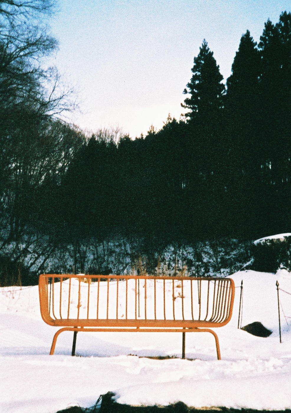 こちらはスキー場で撮った写真。わたしは雪の降らない瀬戸内海で育ったものですから、雪は珍しく写真をたくさん撮りました。赤いベンチが雪に映えています。上と同じく、ペンタックス17の写真です。