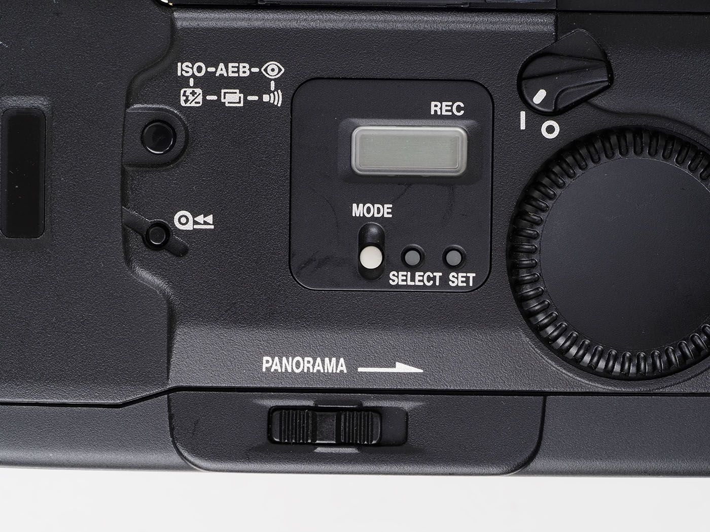 そうそう、パノラマの切り替えレバーもあるなあ、一時流行りましたよね。ファインダー内にはパノラマ時のフレームラインが常時表示されていますが、切り替えるとラインのはじ、上下4点にオレンジのLEDが点灯して、パノラマ切り替えであることを示します。同時にシャッター後ろにパノラマ用の36×13mmマスクが出現します。