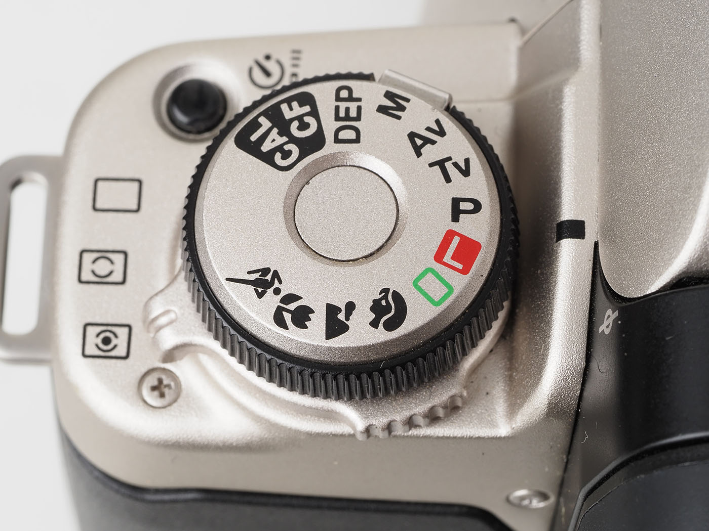 撮影モードダイヤルです。ボディ軍艦部の左上にあります。けっこうゴテゴテとアイコンはあるものの、無視することができるのはありがたいと思っています。