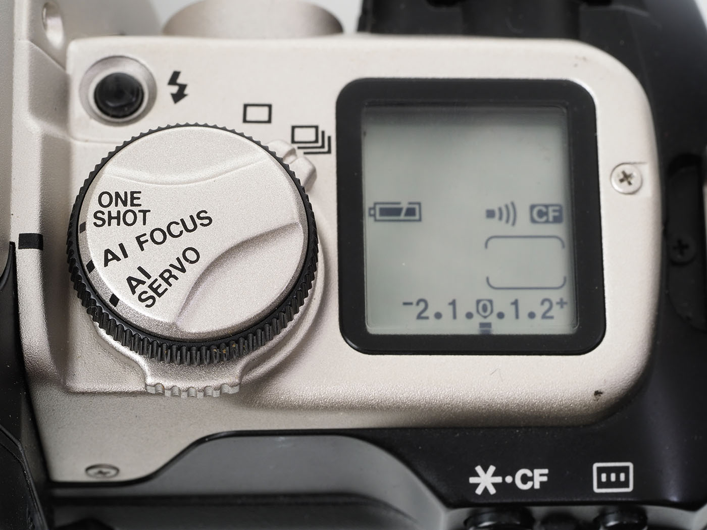 裏蓋も安っぽいんですが、デート機能の他に電子ダイヤルがあったり、ISO感度設定やブラケッティング、視線入力とかフラッシュの露光補正とか、電子音とか多重露光とか、結構多くの機能を切り替えるためのボタンがあります。フィルム巻き戻しボタンもあります。