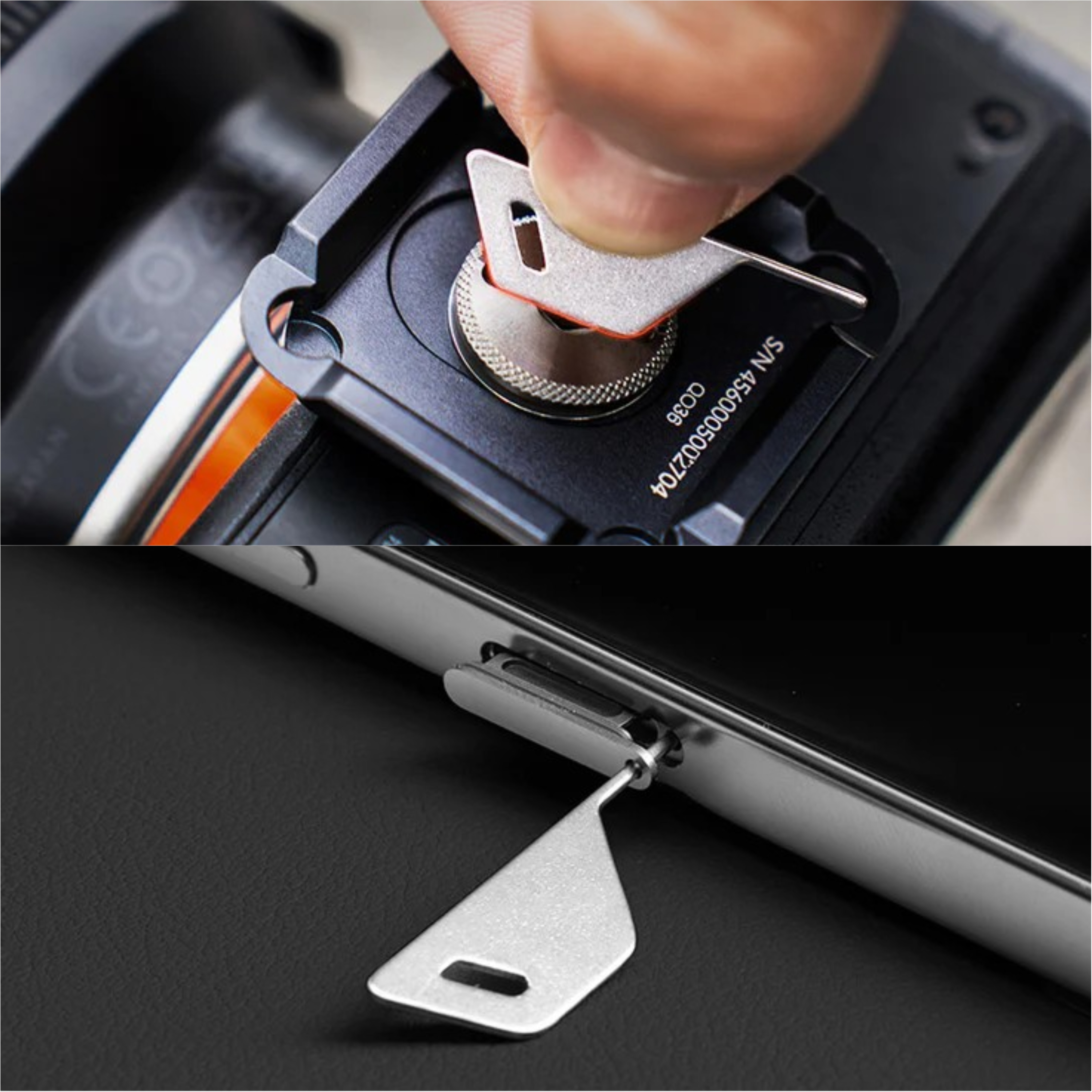 標準装備の多機能イジェクトピンは、メモリーカード/SIMカードを簡単に取り外すことができ、その特徴的な形状によりクイックリリースプレート用の簡易的なマイナスドライバーとしても機能する。