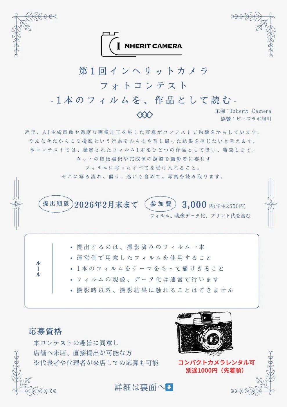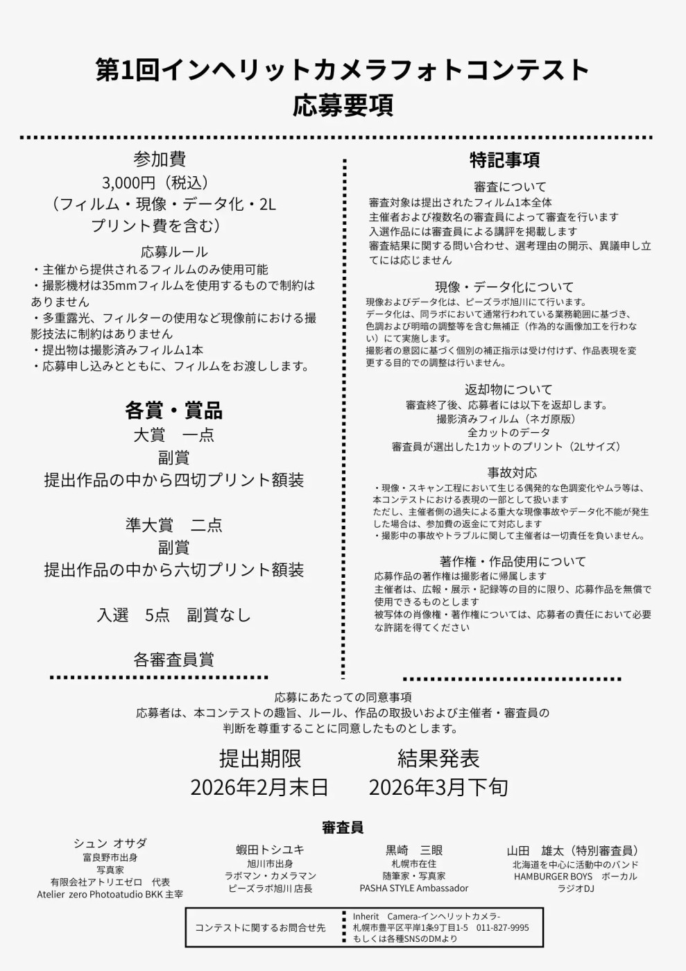 北海道・札幌のインヘリットカメラ主催、第一回フォトコンテスト「一本のフィルムを、作品として読む」が開催される。