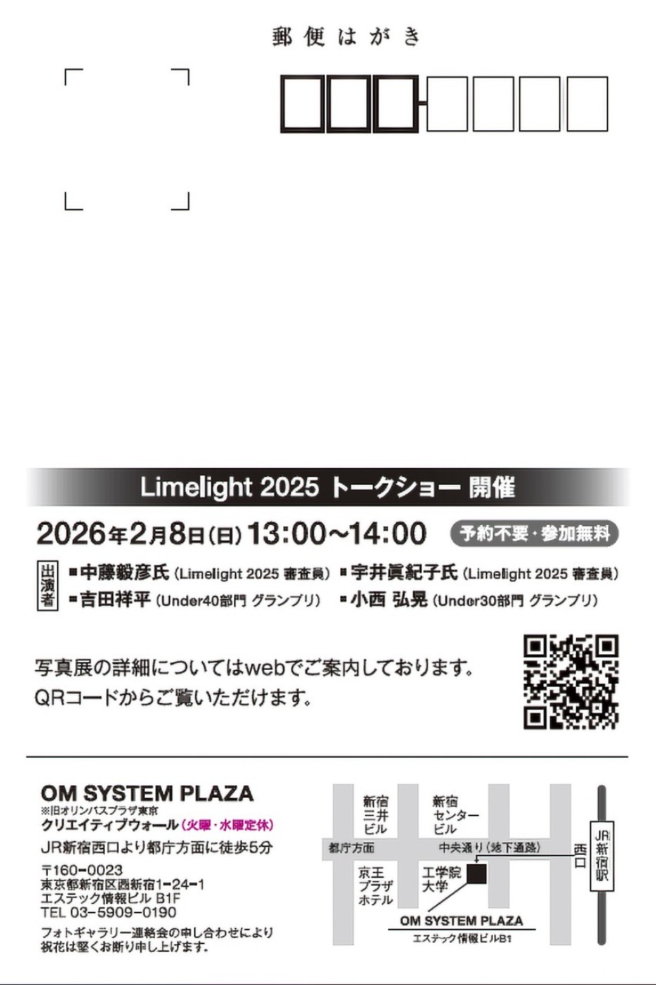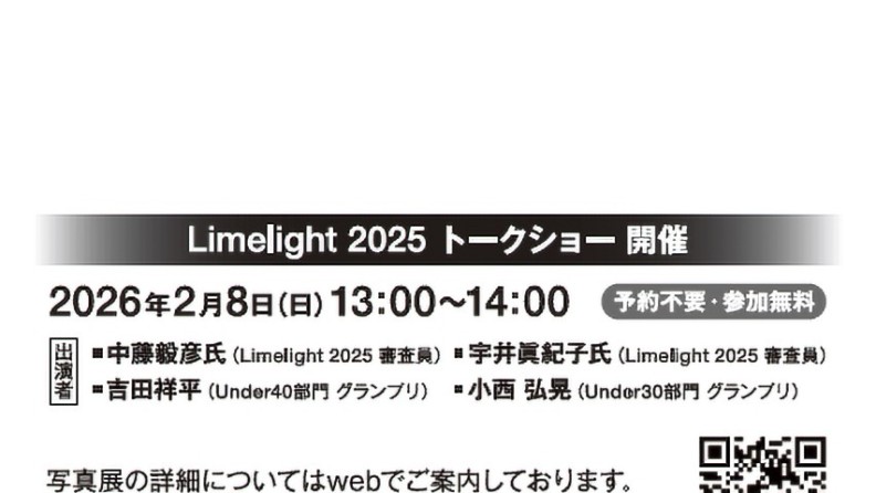 会期中「Limelight 2025」審査員の中藤毅彦と宇井眞紀子、Under40部門 グランプリの吉田祥平、Under30部門 グランプリの小西弘晃を交えてのトークイベントも開催する。