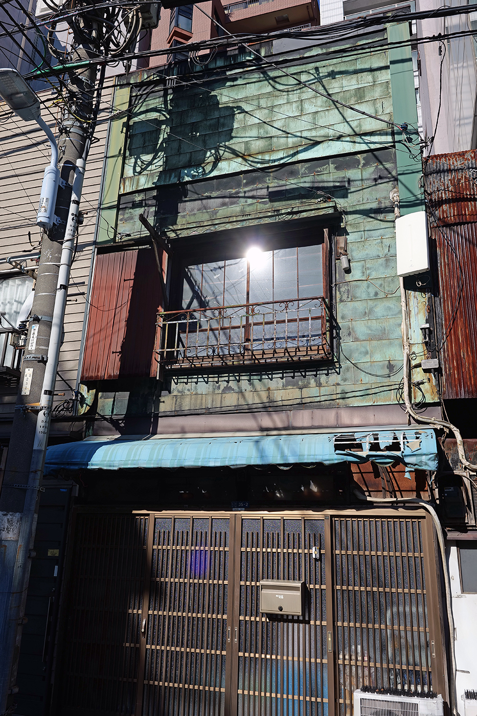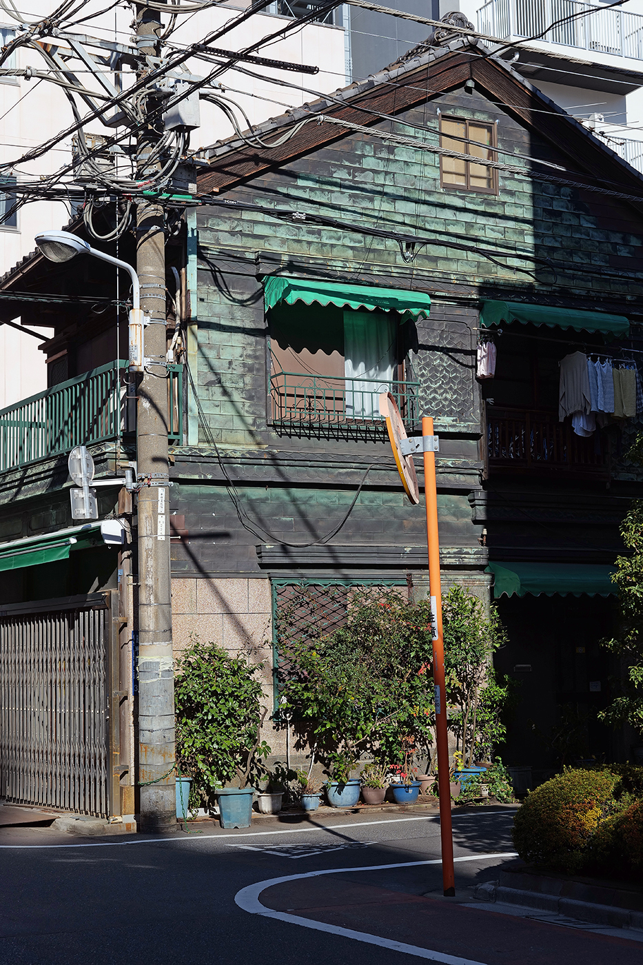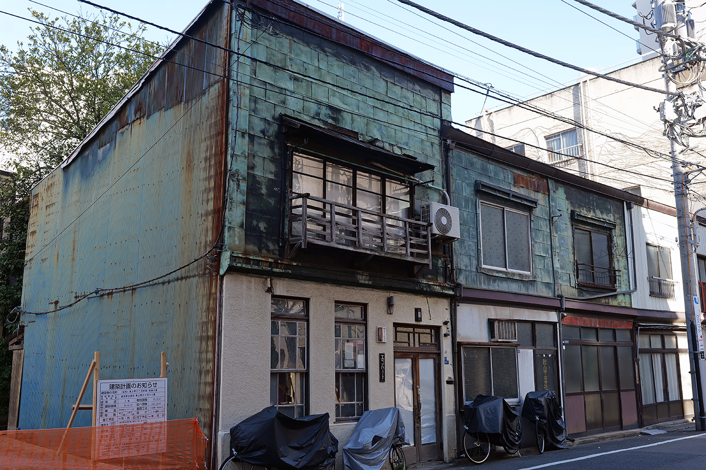 関東大震災(1923年)の時、飛び火で多くの家屋が焼けた。つまり火の粉が降り注いだというわけである。東京ではその震災の教訓から、防火性の高い銅板建築が数多く建てられることとなった。要するに木造住宅の外壁や屋根に銅板を張り、火災による延焼を防ぐ目的で普及したのだが、当時は細部に工夫、細工などに凝った職人技が注がれたという。当初は新しい10円玉のように、キラキラと輝いて、きっと竜宮城のようだったに違いない。それが経年とともに、緑青(ろくしょう)に覆われ、青銅色に変化してしまったのである(③④)。