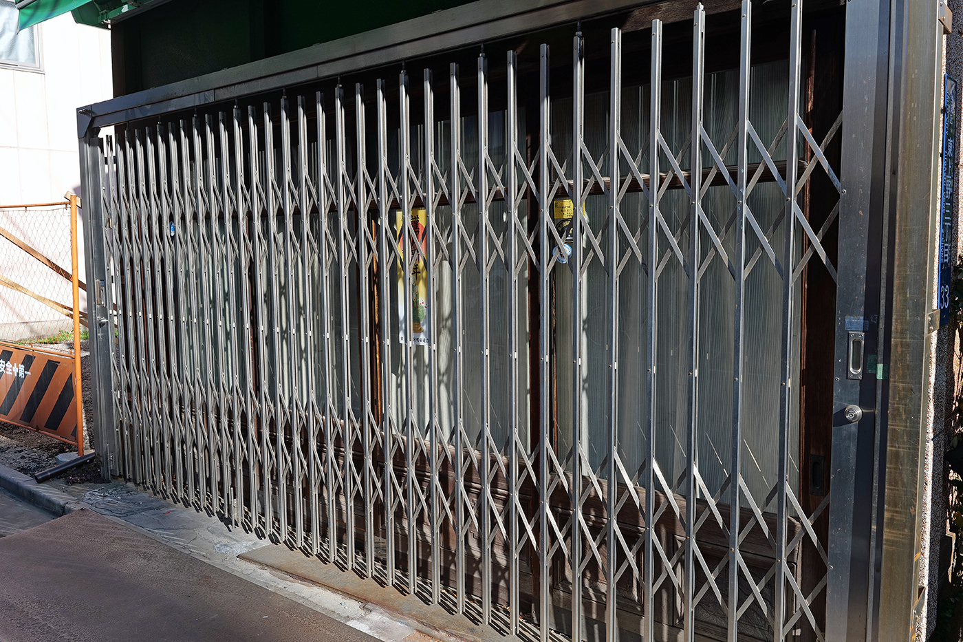 ――これをなんというのだろう? シャッターでいいのかな?――を久しぶりに眼にしたような気がする。この名前、調べたら横引き折り畳みシャッター「フォールディングゲート」ということであった。これって昔はよく眼にしましたけど、最近見ませんよね。あたしの気のせいかな?