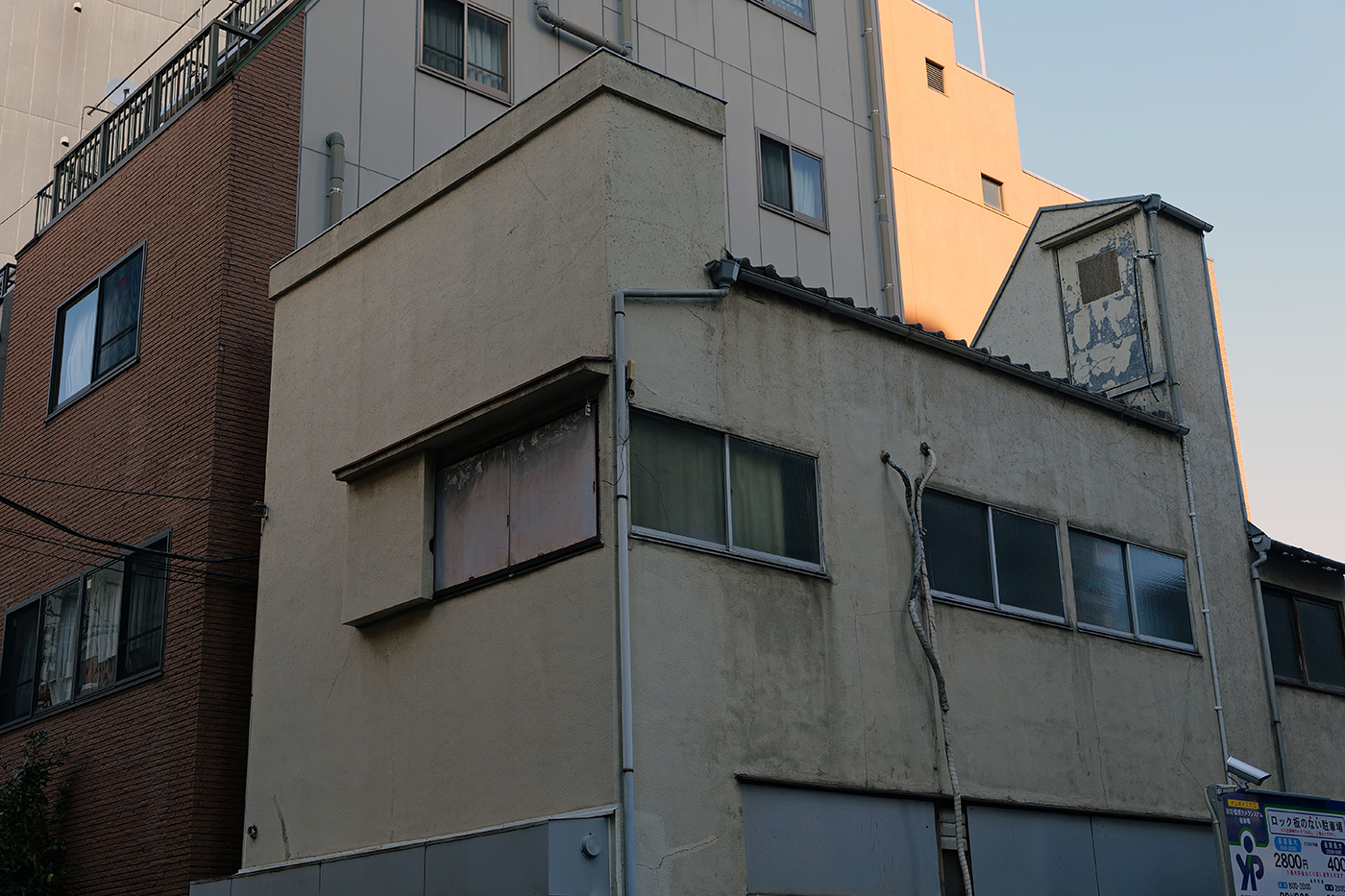 おっと、これですよ、看板建築というのは。瓦屋根を隠すように前面を洋風に見せている壁。もっともあたしは看板建築という呼び方が嫌い。というのも、看板ではありませんからね。あたしはこうした建物を偽壁(ぎへき)建築と呼んでいる。しかしこのお宅、右側が階段なんでしょうが、屋根に出られるようになっている。物干し台があるわけでもなく、なんのためにでしょうか?(⑦)