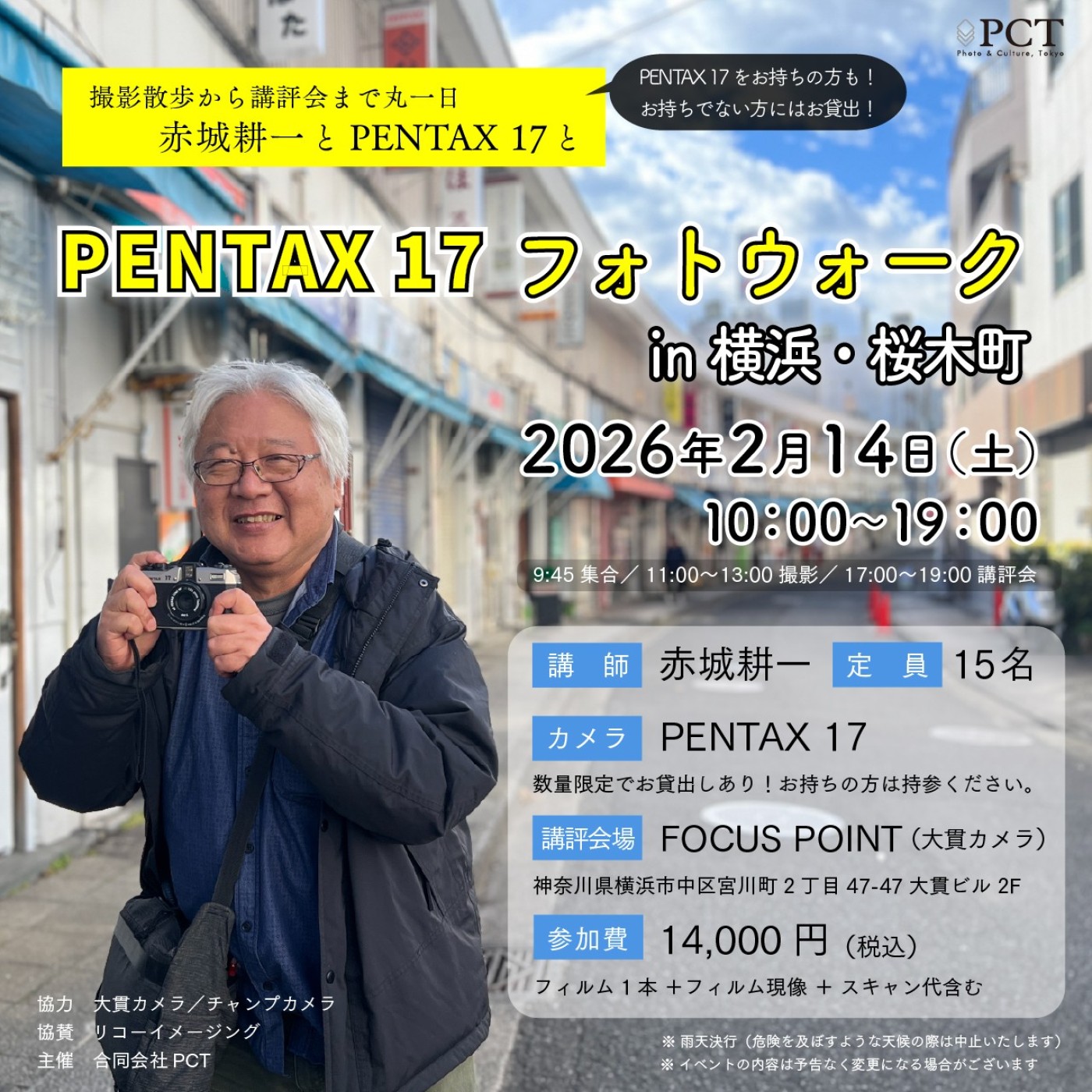 この度弊社PCTはリコーイメージング協賛のもと、講師に写真家 赤城耕一さんをお迎えする「PENTAX 17 フォトウォーク in 横浜・桜木町」を2月14日(土)に開催します。