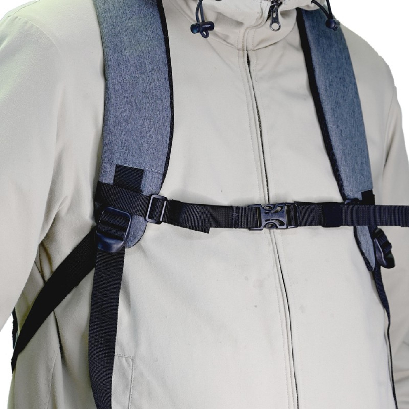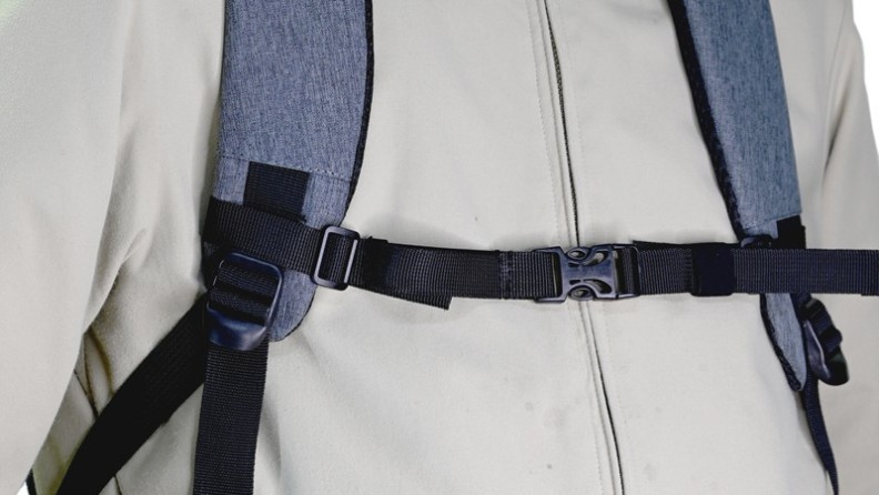 胸の前で留めて固定することで、リュックのベルトのずれ落ちを防止。さらにリュックのフィット感を向上することで移動中の負担を軽減する。