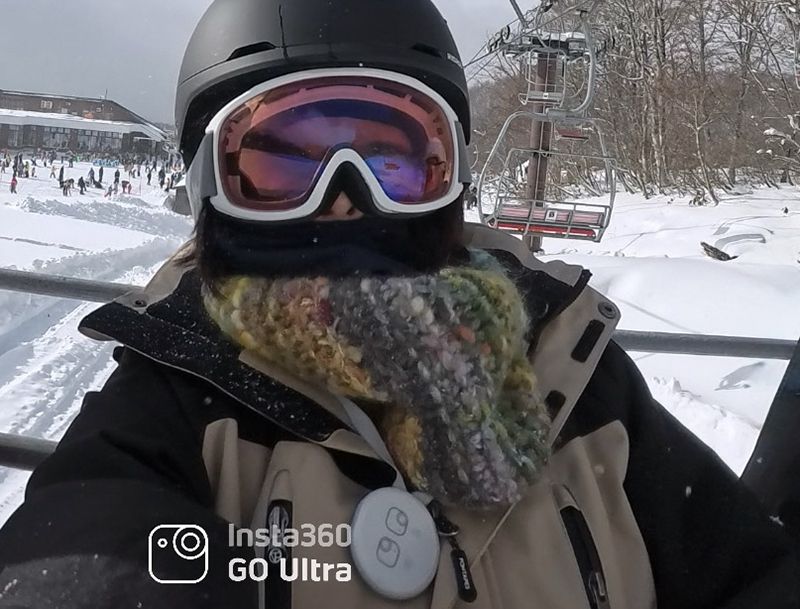 雪の斜面をVの字でゆっくりと削り降りていってるだけなのに、機材だけはずいぶん派手だなクスクス……なんて、まあ、だれも見ていないのに決まっていますが、できればもっと気軽な感じでアクションカムを使いたい。そういう需要に、このInsta360 GO Ultraは本当にぴったりでした。