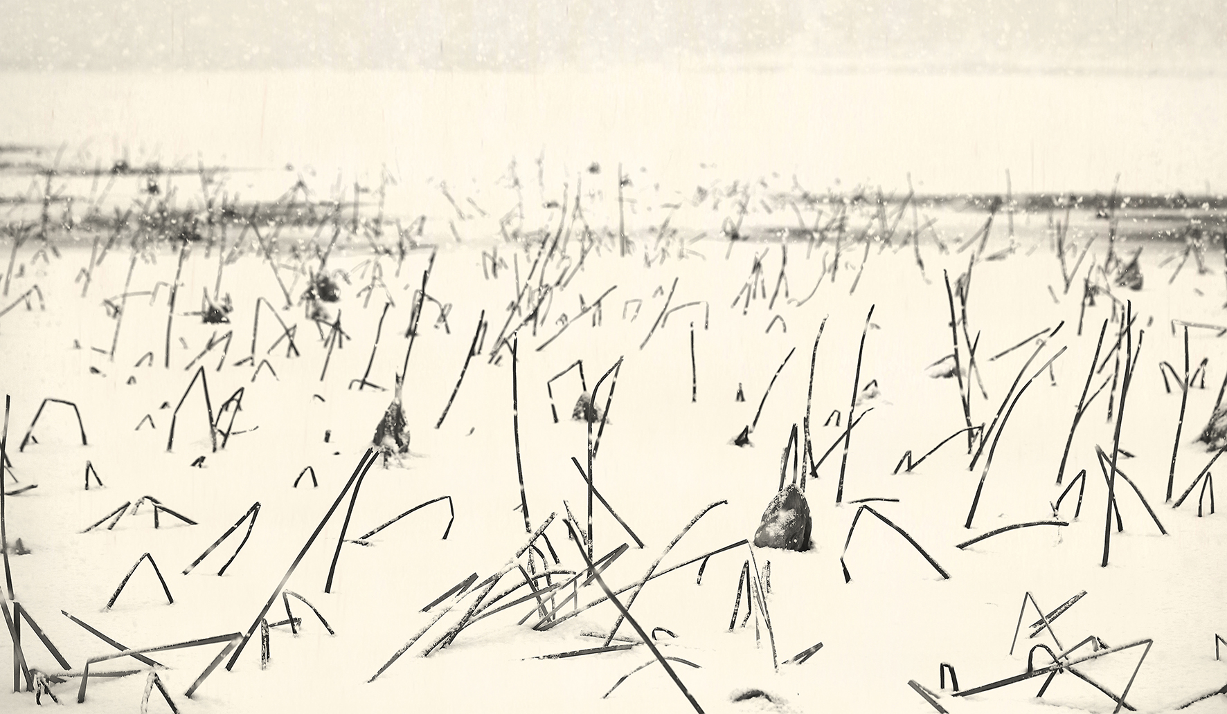 厳寒の季節、群生する蓮の茎が折れて雪に覆われた景色を撮影。10年以上前に捉えた蓮の雪原の姿は、温暖化の影響を象徴するように、最近では見る機会が少なくなったと作家は語る。