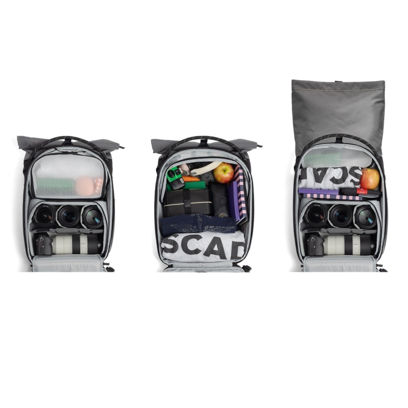 荷物のボリュームに合わせて高さを調整できるSmartLift機構を採用。上下コンパートメントの仕切はベルクロではなくファスナーで固定しているため、開放すると引っかかりのない大容量収納空間を確保することができる。