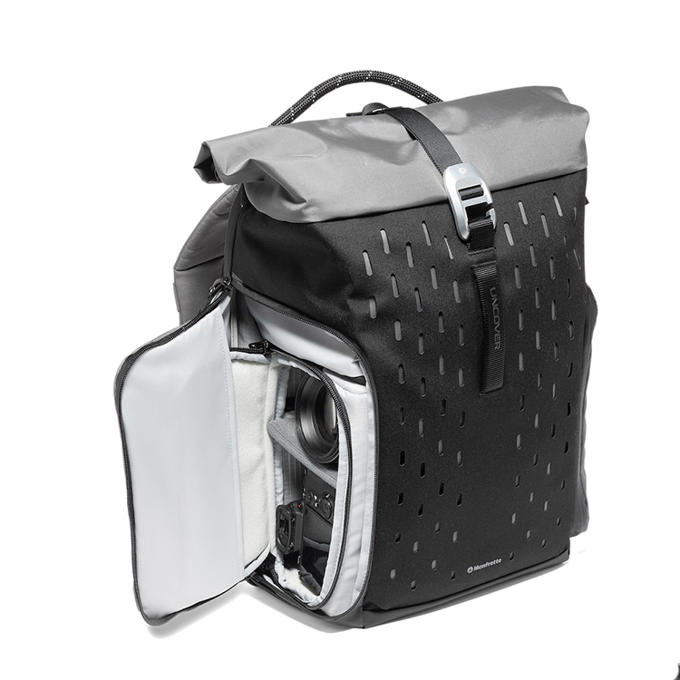 レーザーカットのスリットを多数施した二層構造のコーデュラが、UNCOVERに独自の美しさと存在感を与える。必要なアクセサリーを自在に追加できるカスタムスペースとして機能し、さらにジッパープラーや三脚ストラップをすっきり隠せることで、余計な要素のないシャープで洗練された外観をキープする。