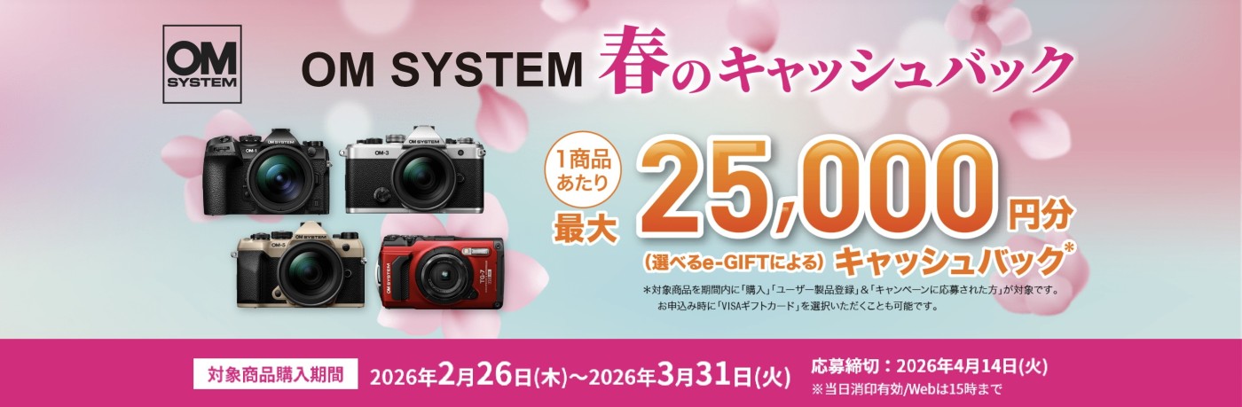 OM SYSTEMは、対象のミラーレス一眼カメラ(レンズキットを含む)、およびコンパクトデジタルカメラを購入いただいたお客さまを対象に、1商品あたり最大25,000円分の「選べるe-GIFT」をプレゼントする「OM SYSTEM 春のキャッシュバック」キャンペーンを 2026年2月26日(木)より実施。