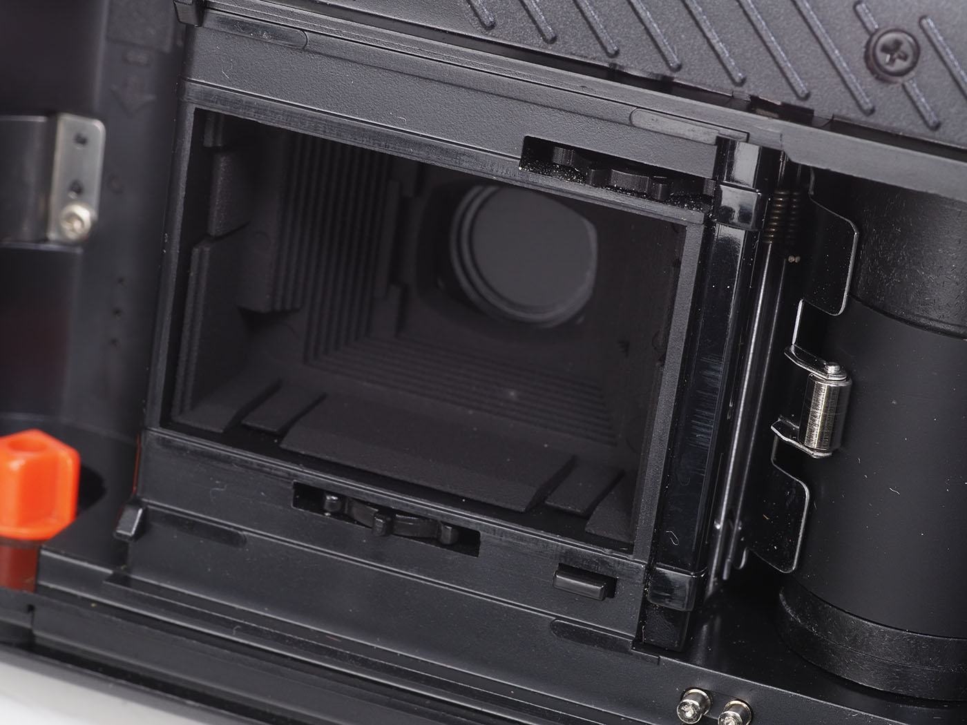 アパーチャー部です。プラスチッキーだけど、仕上げは悪くないですね。フィルムを大切にしている感があって、好感が持てます。スプロケットの上下の位置関係がヘンです。
