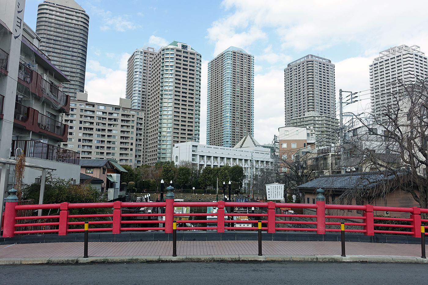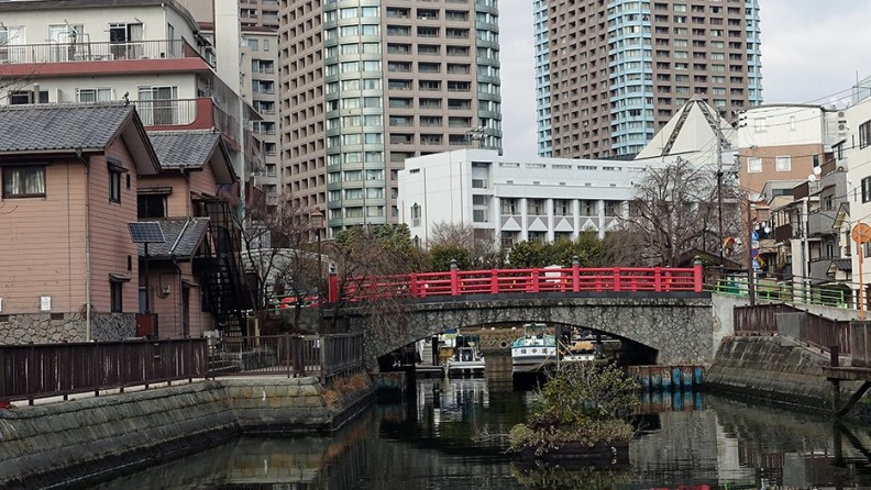 水溜りの先に赤い橋が見えるが、これが佃小橋である。歩いてその橋のところまで出たが、かつてはこのあたりに、何艘か小船が係留されていた。