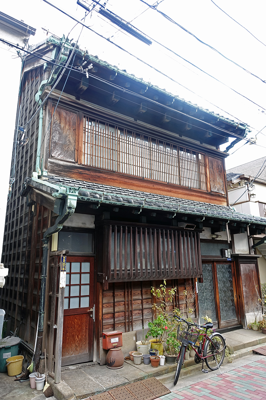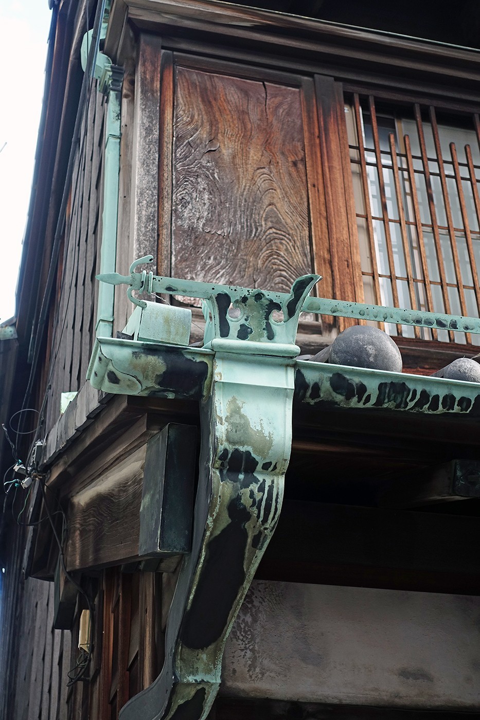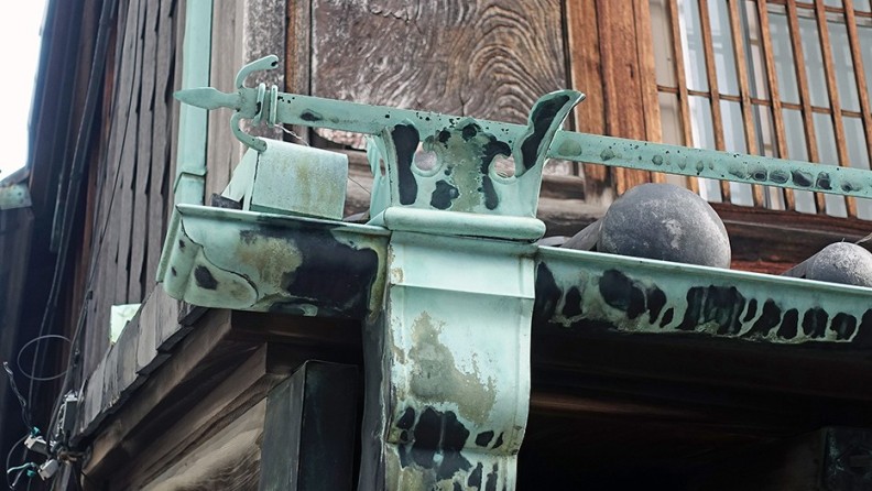 こりゃ~建てた当初は相当なお金かかったんじゃありませんか? 2階のガラス戸の格子も当時のままと思われるが、これってガラス戸を開けても手も顔も出せないってことですかね? あたしはこのような格子を他で見たことがない。銅の樋(とい)も凝っていて、かなりのお金かかっておりますぞ(⑨)。