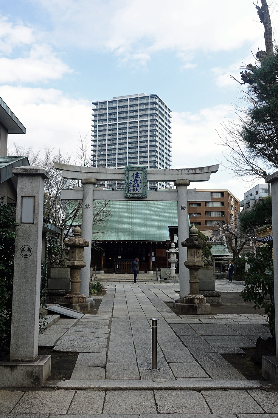 佃島の隅田川寄りには住吉神社が建立されている。佃島は前掲のように摂津国の佃村から移住した漁師たちが築いたのだが、その人物たちが故郷の田蓑神社(旧・住吉社)から分霊を分社して、創建をした神社である(③)。