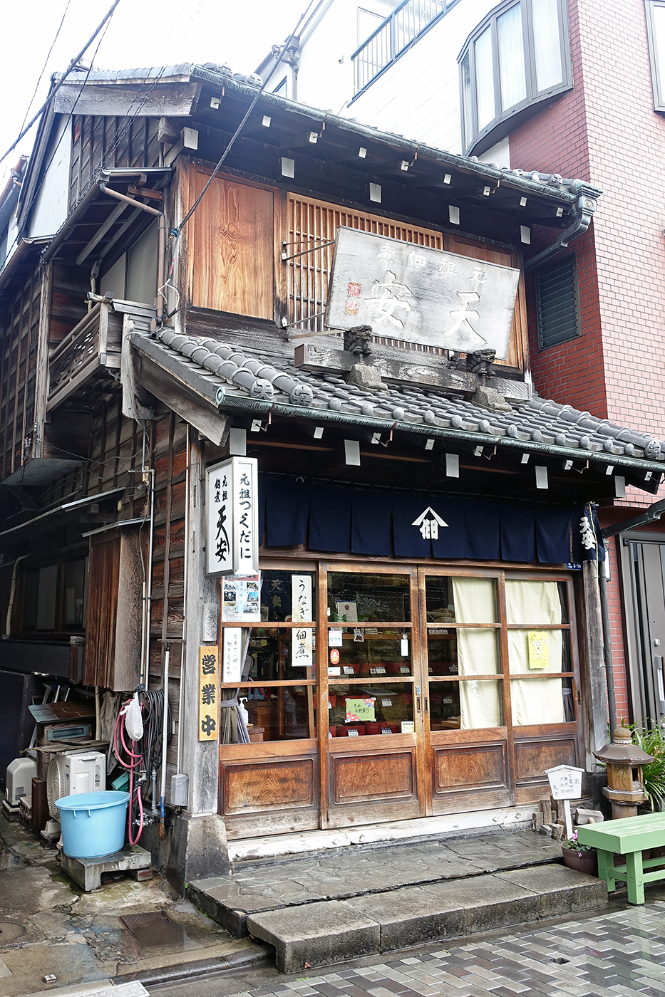 佃島は元来漁師町である。江戸時代初期に徳川家康が本能寺の変で窮地に陥った時、摂津国(大阪)の佃村の漁師の助けで逃げ延びることが出来た。家康は1646年に佃村の漁師を江戸に呼び寄せ、その漁師が築いたのが佃島である。彼らが、漁で獲れた売り物にならない小魚を日持ちするように煮詰めたものが「佃煮」であり、家康には白魚を献上したと伝えられている。佃島には今も佃煮屋が何軒か残る――この「天安」、いい佇まいである(②)。