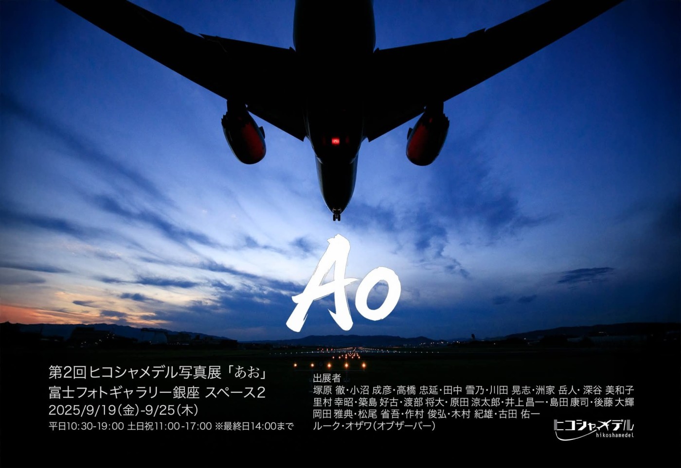 - 私たちはヒコーキに魅了され、その瞬間を写真に収めることで空の美学を追求し、ヒコーキ写真の撮影技術向上を探求し、作品を通じて空の広がりや自由、郷愁や旅情を伝えます。日本各地から集まったメンバーは19名。引き続き航空写真家ルーク・オザワ氏をオブザーバーに迎え、テーマである「あお(Ao)」を一年追いかけました。青、蒼、碧、ブルー・・・いろいろある「あお(Ao)」をメンバー各々が思い想いに作品として展示いたします。