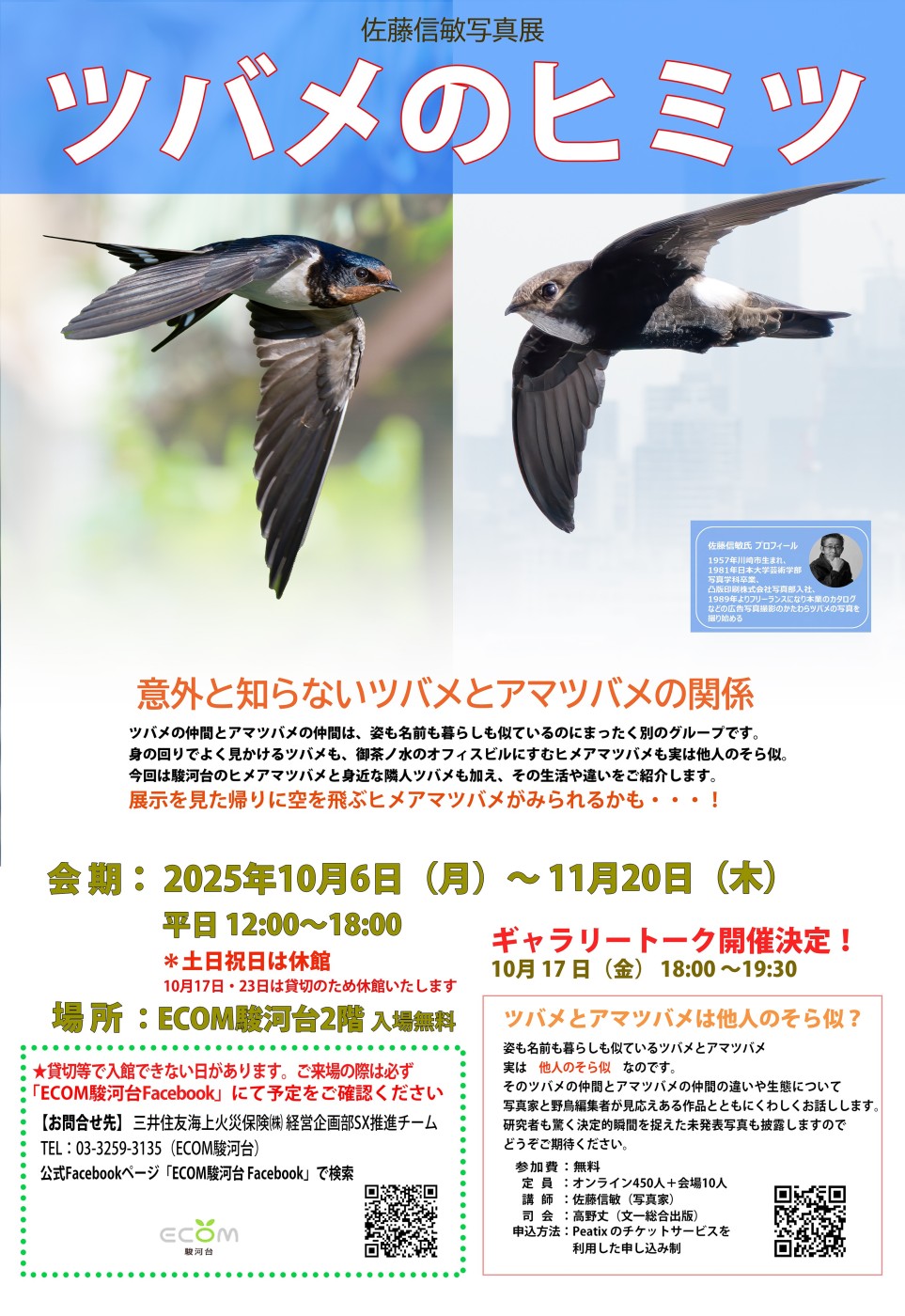 - 佐藤信敏写真展「ツバメのヒミツ 意外と知らないツバメとヒメアマツバメの関係」