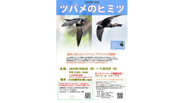東京都 ツバメのヒミツ 意外と知らないツバメとヒメアマツバメの関係 佐藤信敏 会期 2025年10月6日(月)~11月20日(木) 会場 ECOM駿河台